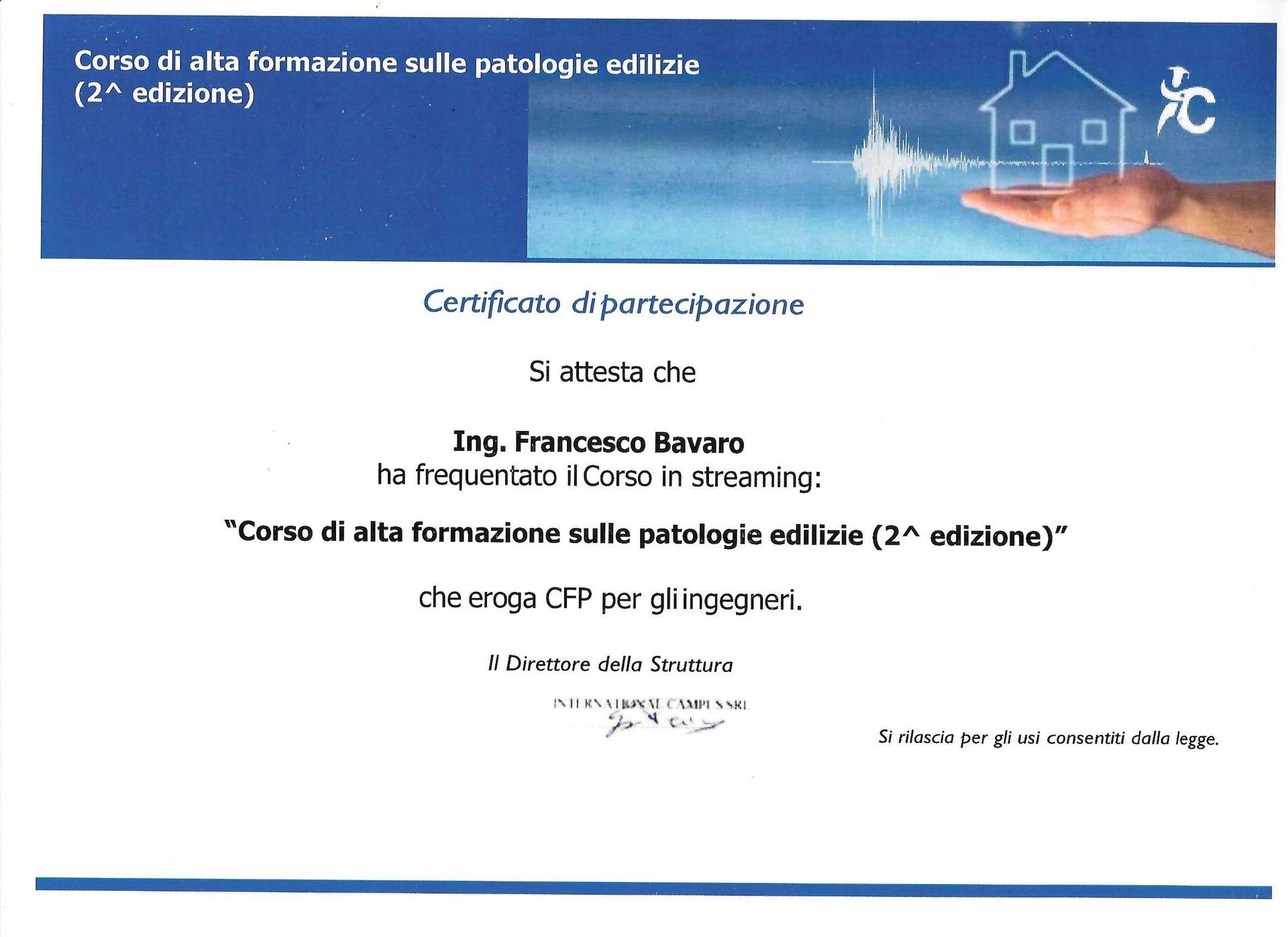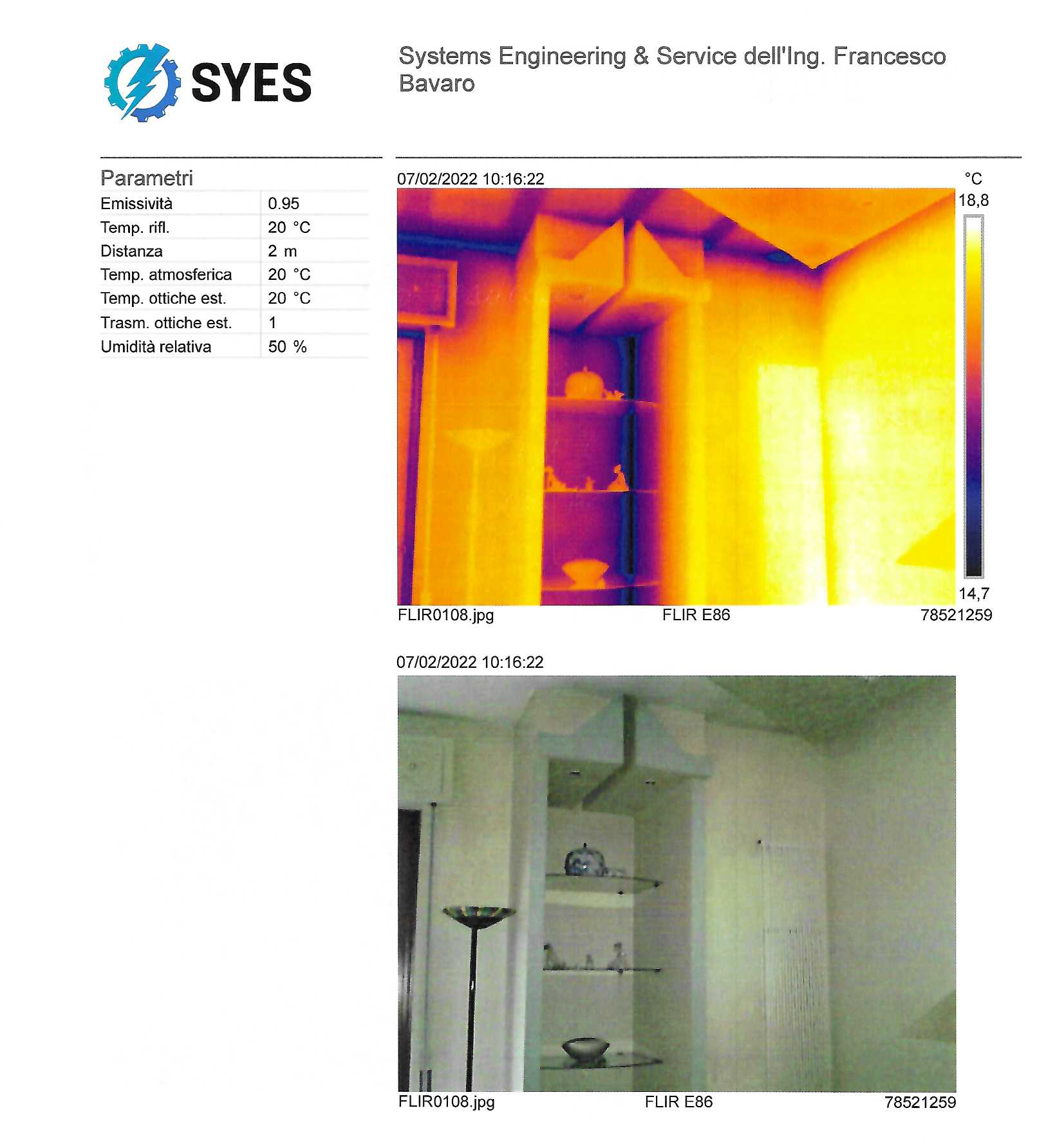 - Termografia IR per diagnosi di Patologie Edilizie: infiltrazioni, umidità, muffa, sali, crepe. (Operatore termografico qualificato al livello 2 in conformità alla norma UNI EN 9712:2012 ed al Regolamento RINA RC/C 14).